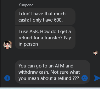 I asked for cash sale and this one couldn’t seem to comprehend visiting an ATM to get cash…. with the refund comment, I suspect it was going to be a transfer scam.